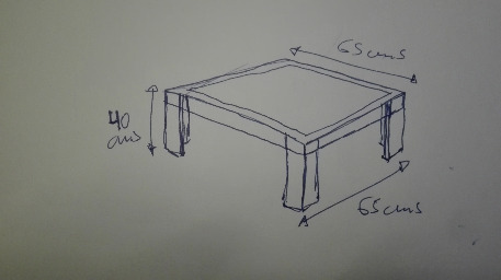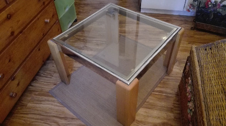 Hola, ofrezco mesa rinconera de cristal, con patas de madera y resto de soportes metálicos. El esquema con las medidas está en una de las fotos.